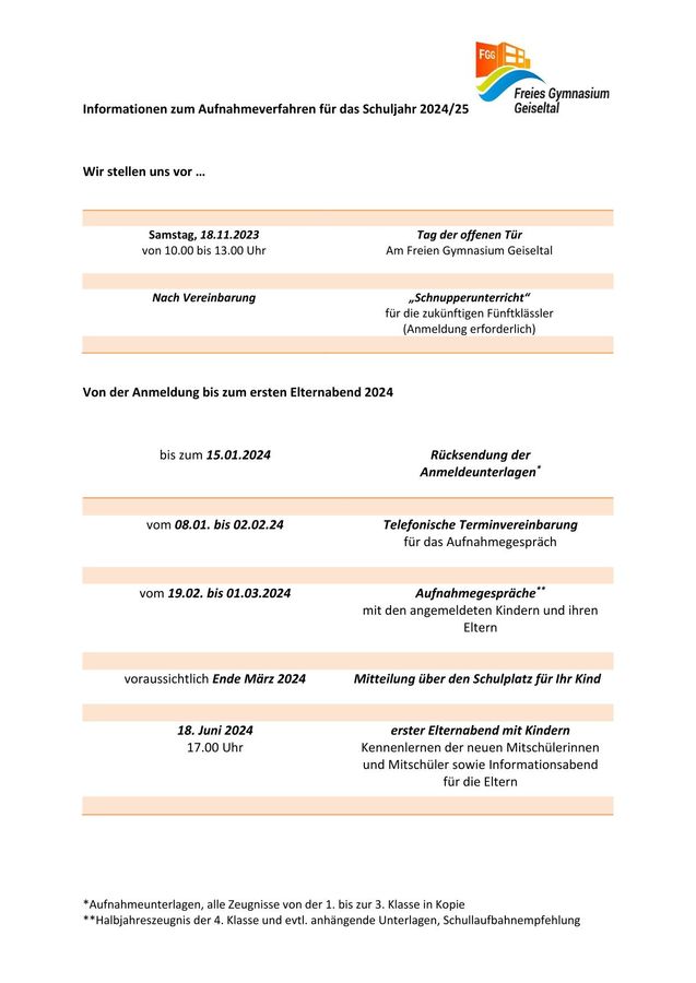Informationen zum Aufnahmeverfahren für das Schuljahr 2024/25