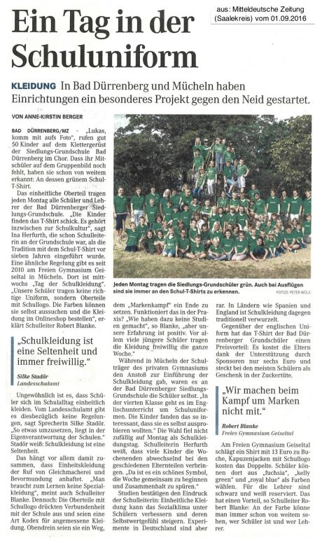 seit der Schulgründung im Jahre 2009 tragen die Schülerinnen und Schüler an unserem Gymnasium Schulkleidung. Es ist KEINE Uniform, wie einige Kritiker behaupten könnten, sondern sie umfasst lediglich sämtliche Formen und Varianten von Oberteilen...also T-Shirts, Poloshirts, Sweatshirts, Jacken usw.! Unser Motto dabei lautet "Einheit durch Vielfalt". Einziges Kriterium für die Textilien ist das einheitliche Logo unseres Gymnasiums. Von welcher Art oder Farbe das Oberteil ist, spielt dabei keine Rolle. Einmal je Woche - nämlich immer mittwochs - ist an unserer Schule der "Tag der Schulkleidung". Dann sind alle Schüler aufgerufen, ihre Schulkleidung zu tragen und auf diese Weise auch visuell ihre Zugehörigkeit zu unserer Schule zum Ausdruck zu bringen. Wer seine Identifikation mit der Schule auch an anderen Tagen zeigen möchte, darf und soll das selbstverständlich gern tun. Alle Schüler sind mit der Schulkleidung, die günstig in unserem Partnershop zu erwerben ist, jederzeit respektiert und anerkannt - auch ohne teure Markenkleidung!