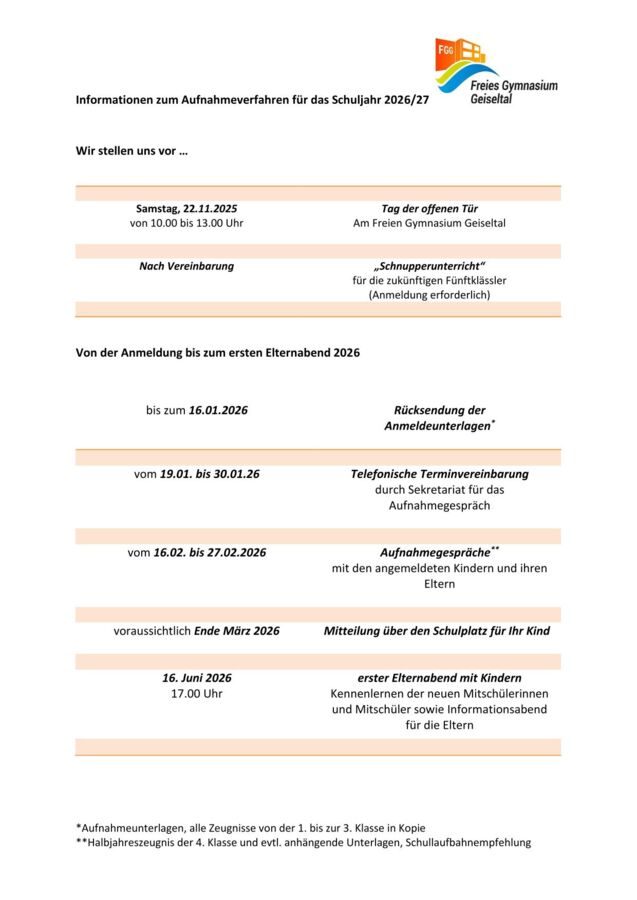 Informationen zum Aufnahmeverfahren für das Schuljahr 2026/27